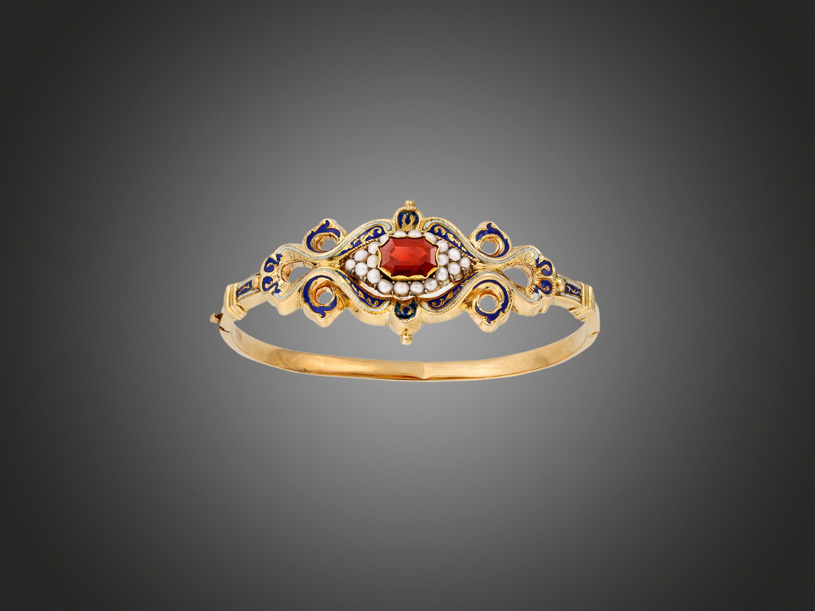 Arany 375, keskeny nyitható pánt középrészén fazettált csiszolású gránát és apró igazgyöngy díszítéssel, 1860 körül, után fémjelzett, 9,8 g, átmérő: 6 cm