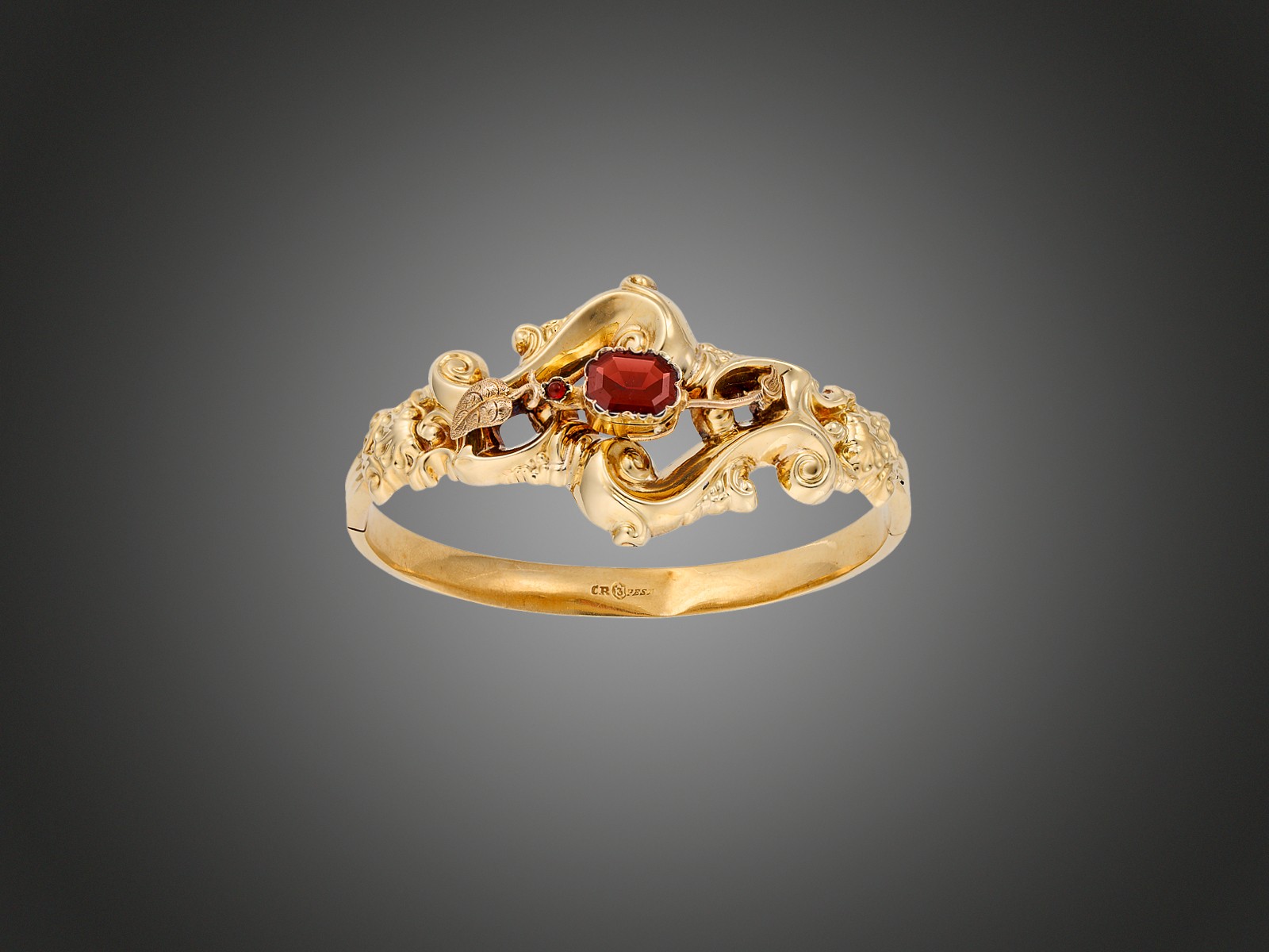 Antik arany, nyitható reif kiszélesedő középrészén fazettált csiszolású gránát díszítéssel, Pest 3, jelzéssel, 13,3 g, átmérő: 5,5 cm, horpadt