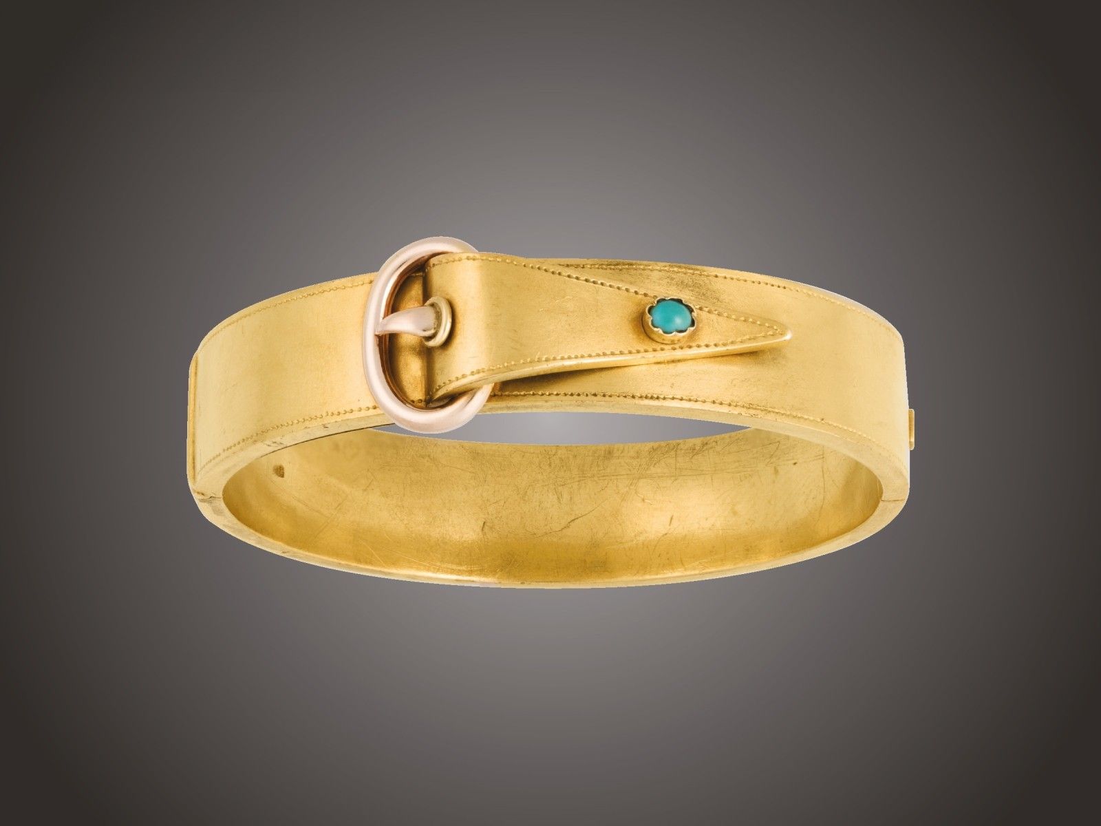 Arany 580, nyitható pánt, középrészén övcsathoz hasonló díszítőelem, 1 türkiz kaboson díszítéssel, Bécs, 1872-1922 között jelzett, 19,0 g, átmérő: 5,5 cm