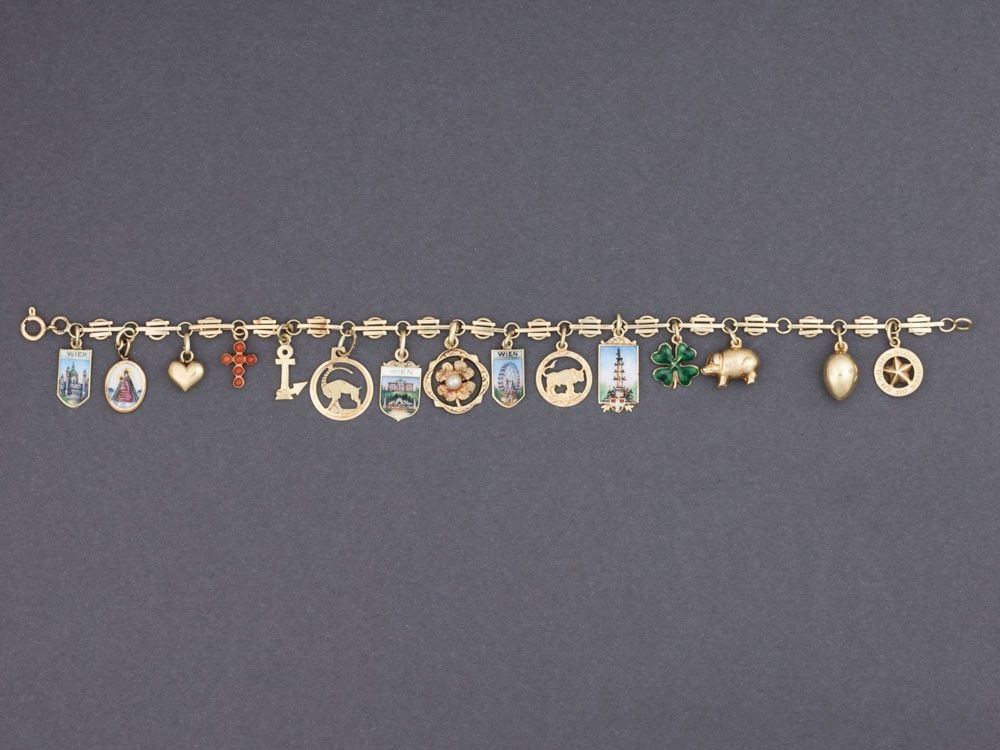 Arany 585, vékony karlánc, 6 zománcdíszítésű és 9 szerencse motívumos függővel, ugrókarika záródással, 9,8 g, hossz: 17 cm