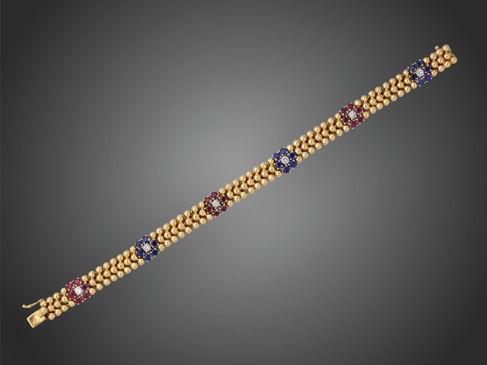 Arany 750, 3 soros, golyó mintás pánt, ismétlődő zafír_x000D_