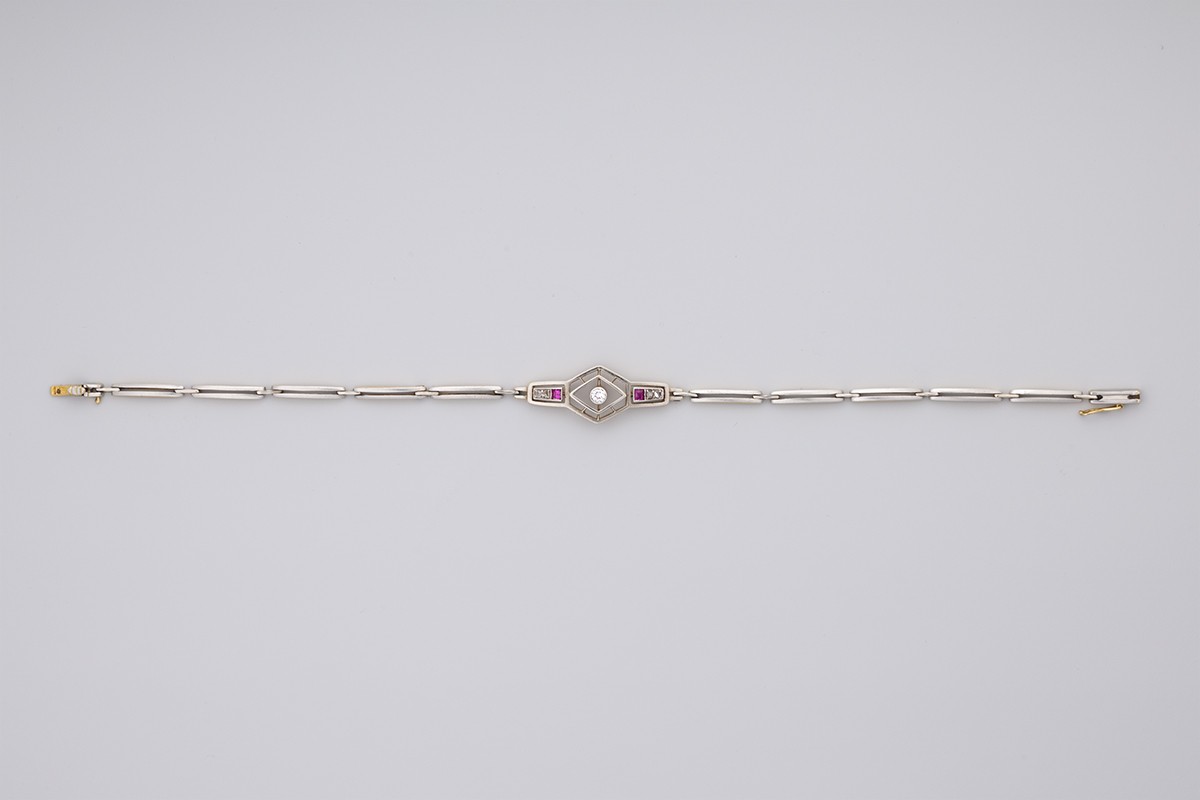 Arany 585, keskeny, tagolt karpánton, áttört közép, 1 régi csiszolású briliáns cca. 0,08 ct, N, P1, 2 rubin és 4 gyémánt cca. 0,05 ct, 6,5 g, hossz: 19 cm