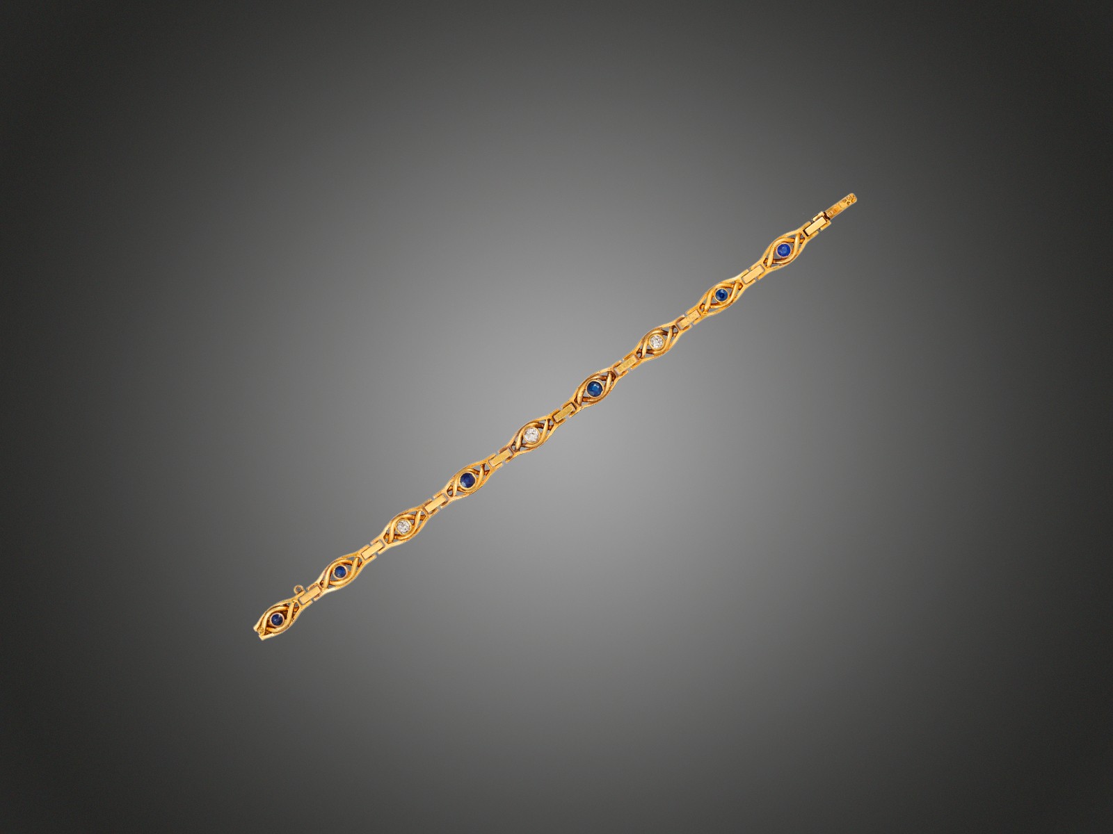 Arany 585, 5 zafír cca. 0,80 ct és 3 régi csiszolású