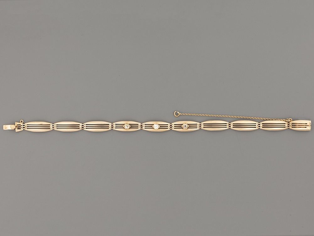 Karkötő Arany 585, áttört, ovális szemekből, középtagon3 care foglalt régi csiszolású briliáns cca. 0,25 ct(R2CrP1) ékítéssel, ny