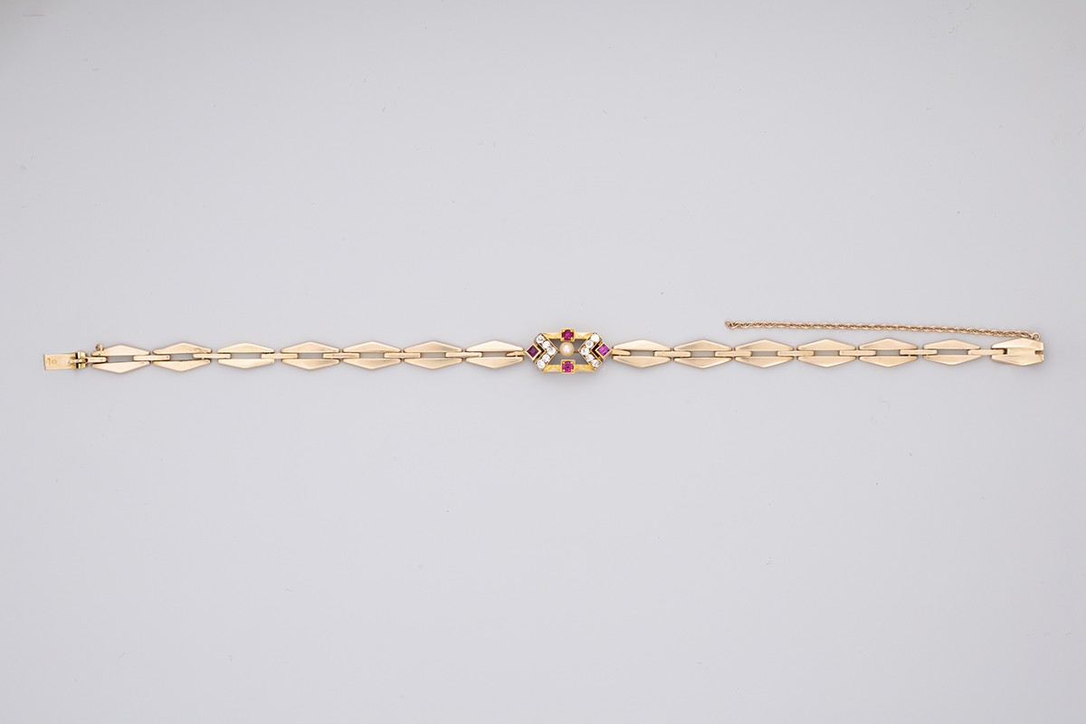 Arany 585, rombuszforma tagok, középelemen 10 régi csiszolású briliáns cca. 0,20 ct, M, SI, apró gyöngy és szintetikus rubin, 12,7 g, hossz: 21 cm