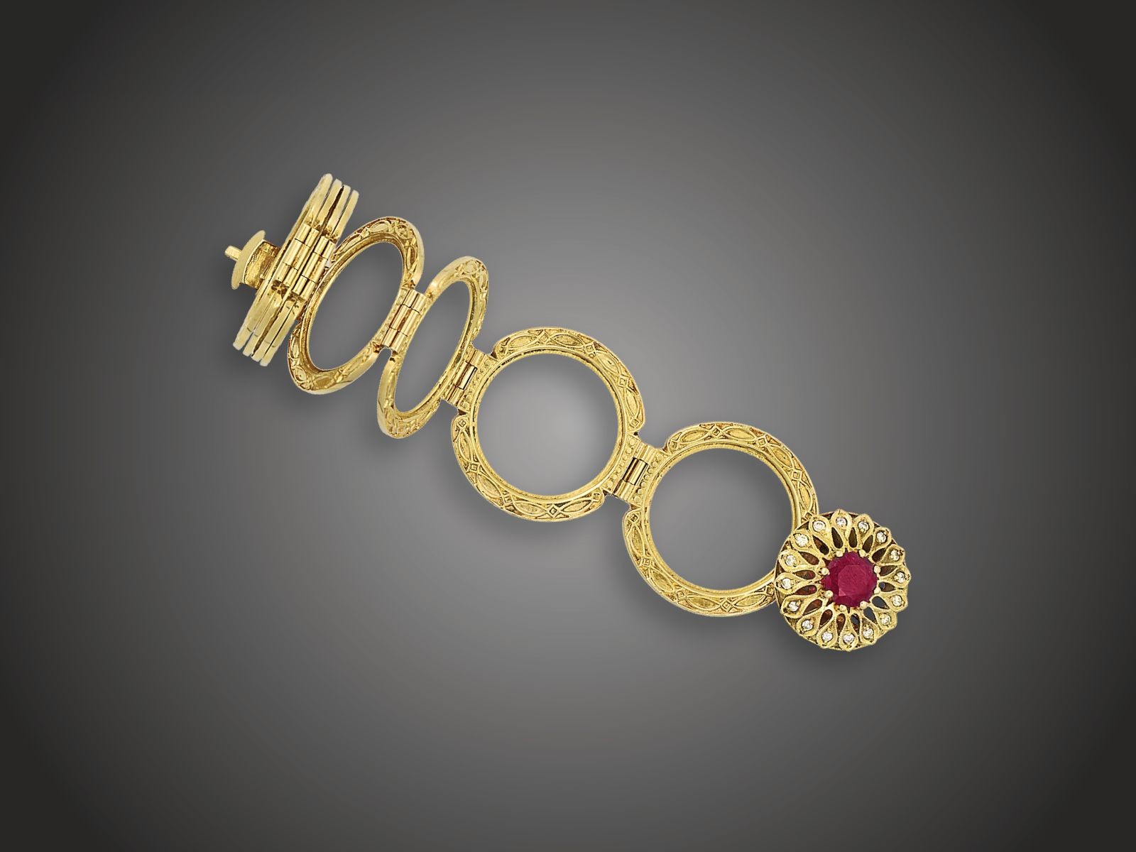 zárján virágmotívum díszítés, 1 rubin cca. 0,50 ct és_x000D_