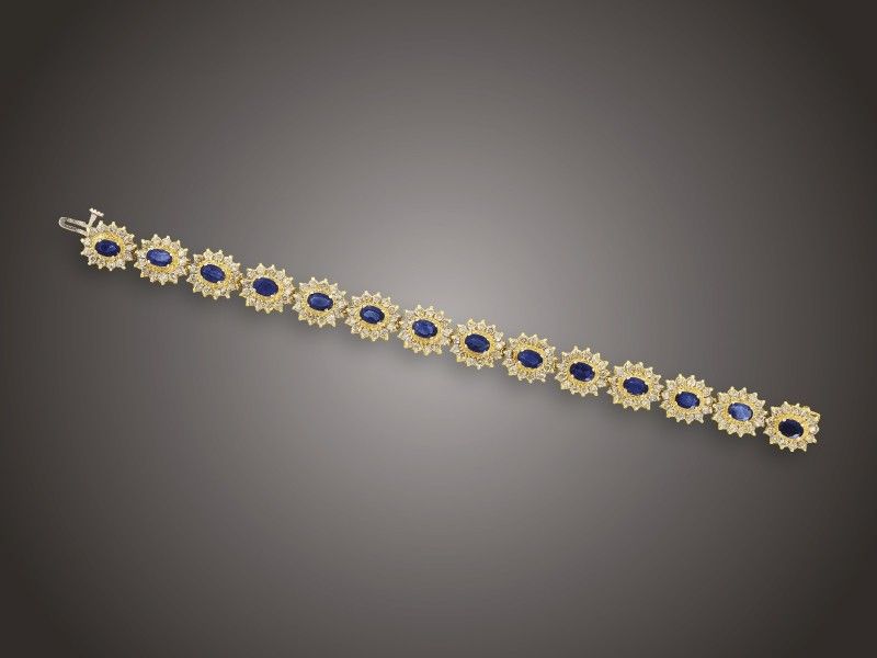 Karkötő Arany 585, 14 karmos foglalású, fazettált csiszolású zafír cca. 9,80 ct és 182 pezsgő színű briliáns cca. 5,46 ct (MYP2) ékítésű, karmazált fazonú tagok, nyelves zárral, 26,3 g, hossz: 17,5 cm