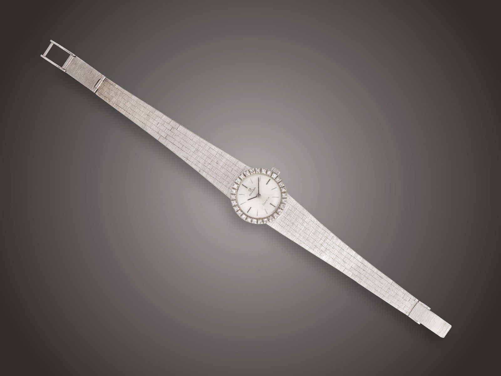 Fehérarany 750, matított karpántba épített kerek óratok, lünettán 28 achtkant csiszolású briliáns cca. 0,50 ct (ATCrVs) ékítéssel, indexjelzéses fém számlap, jelzett Omega, kézi felhúzós működő szerkezet, bruttó 43,8 g, hossz: 19 cm,