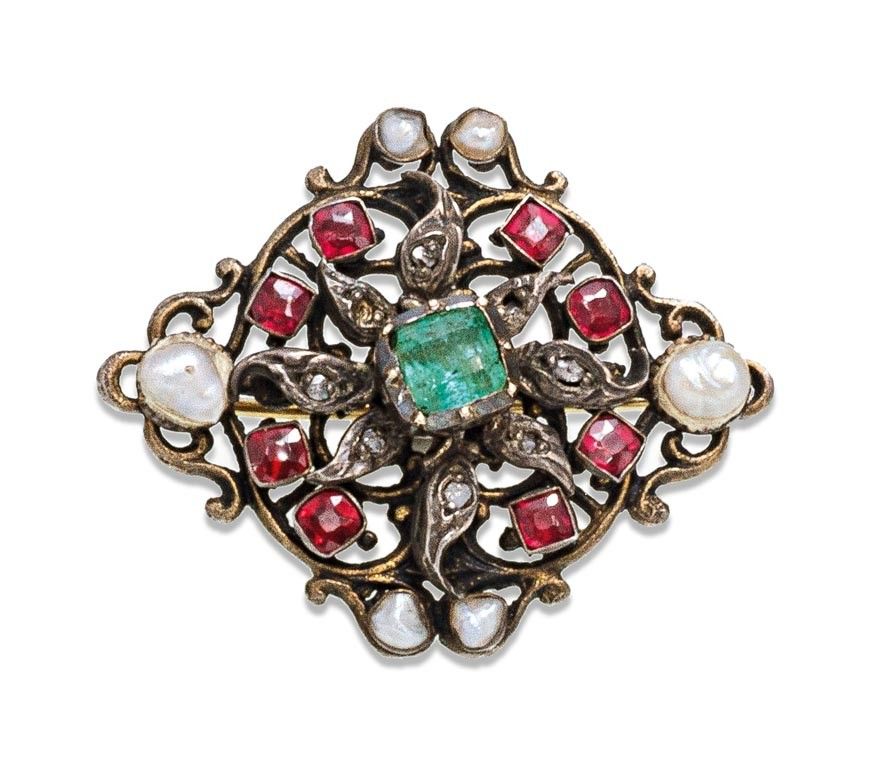 19. sz. vége, ezüst, áttört felső rész, középen tokos foglalatban 1 db aláfóliázott smaragd, 8 db rubin kő utánzattal, 6 db fehér gyönggyel, 1 apró, kő hiánnyal, arany tű szerelékkel alakítva, 9,7 g; 3,5*3 cm