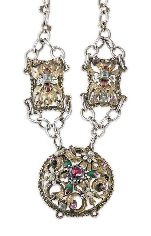 Erdély(?), 19. sz. eleje, 3 öntött tag, tűzaranyozott antik ezüst, 1 nagyobb és több kisebb szintetikus rubinnal, további apró aláfóliázott smaragdokkal, gyöngyökkel, színes rekeszzománc díszítéssel,, összekötő anker lánca fém, kis sérülésekkel, 1kő hiánn