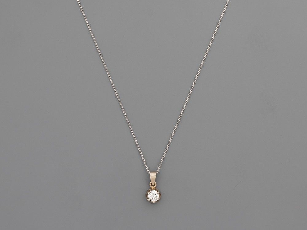 Fehérarany 585, vékony anker láncon szoliter függő, 1 nagyobb régi csiszolású briliáns cca. 0,65 ct (R2CP1) ékítéssel, 2,3 g, hossz: 44 cm