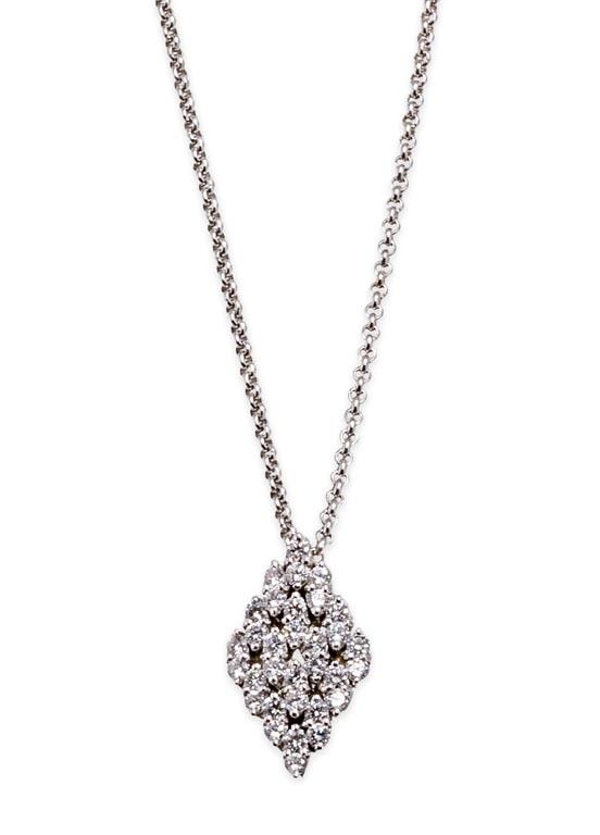 20. sz. második fele, 2016 utáni budapesti fémjellel ellátva, 14 k fehérarany anker lánc és rombusz medál, karmos foglalatban 32 db briliáns cca. 0,96 ct (M1, W, VVS), apró sérüléssel, 13,1 g; 2,2*1,3 cm, lánc: 48 cm