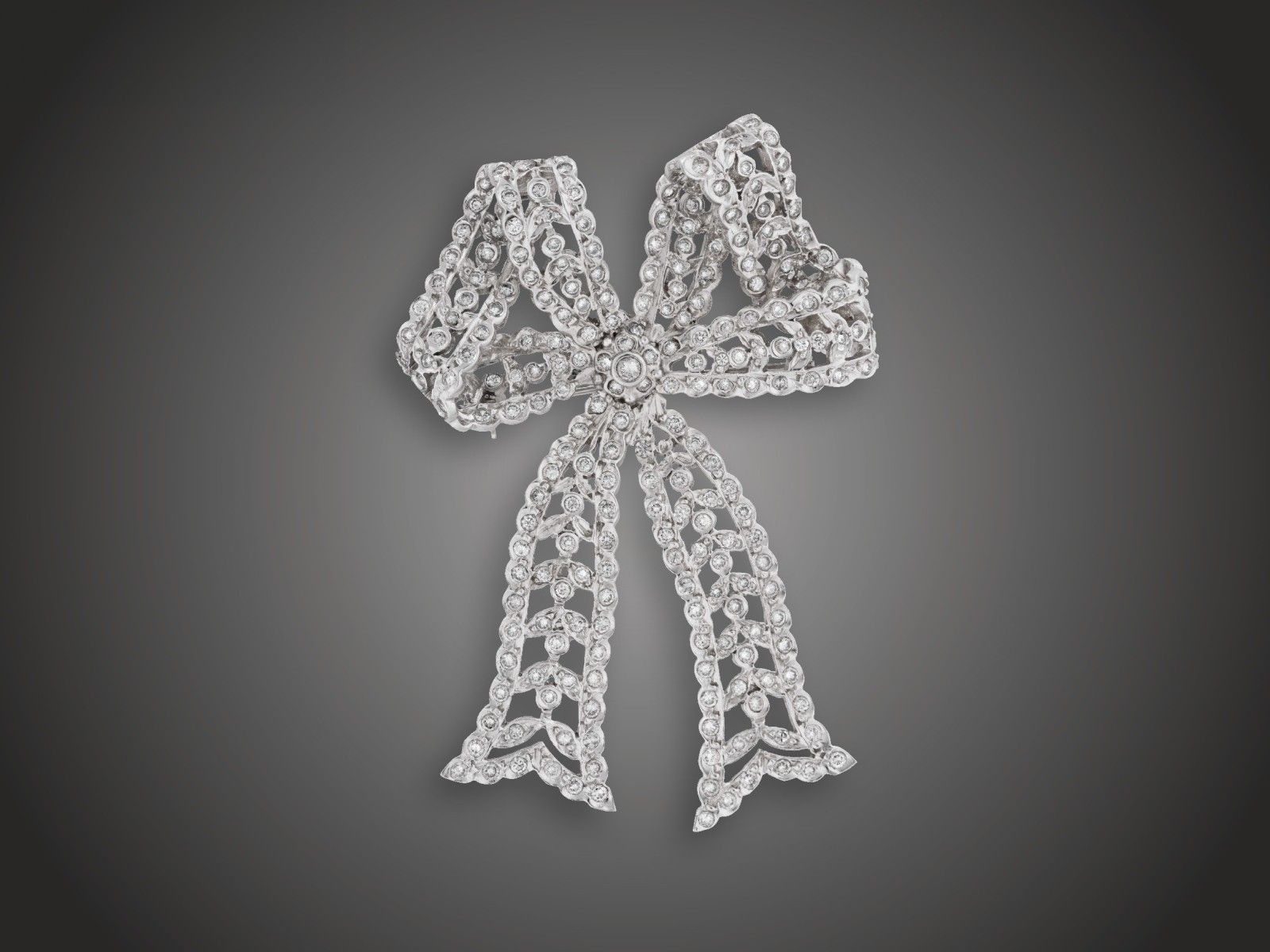 Fehérarany 585, áttört csipkemintás szalagcsokorforma, 230 apró briliáns cca. 2,50 ct (MCrSi) ékítéssel, 24,5 g
