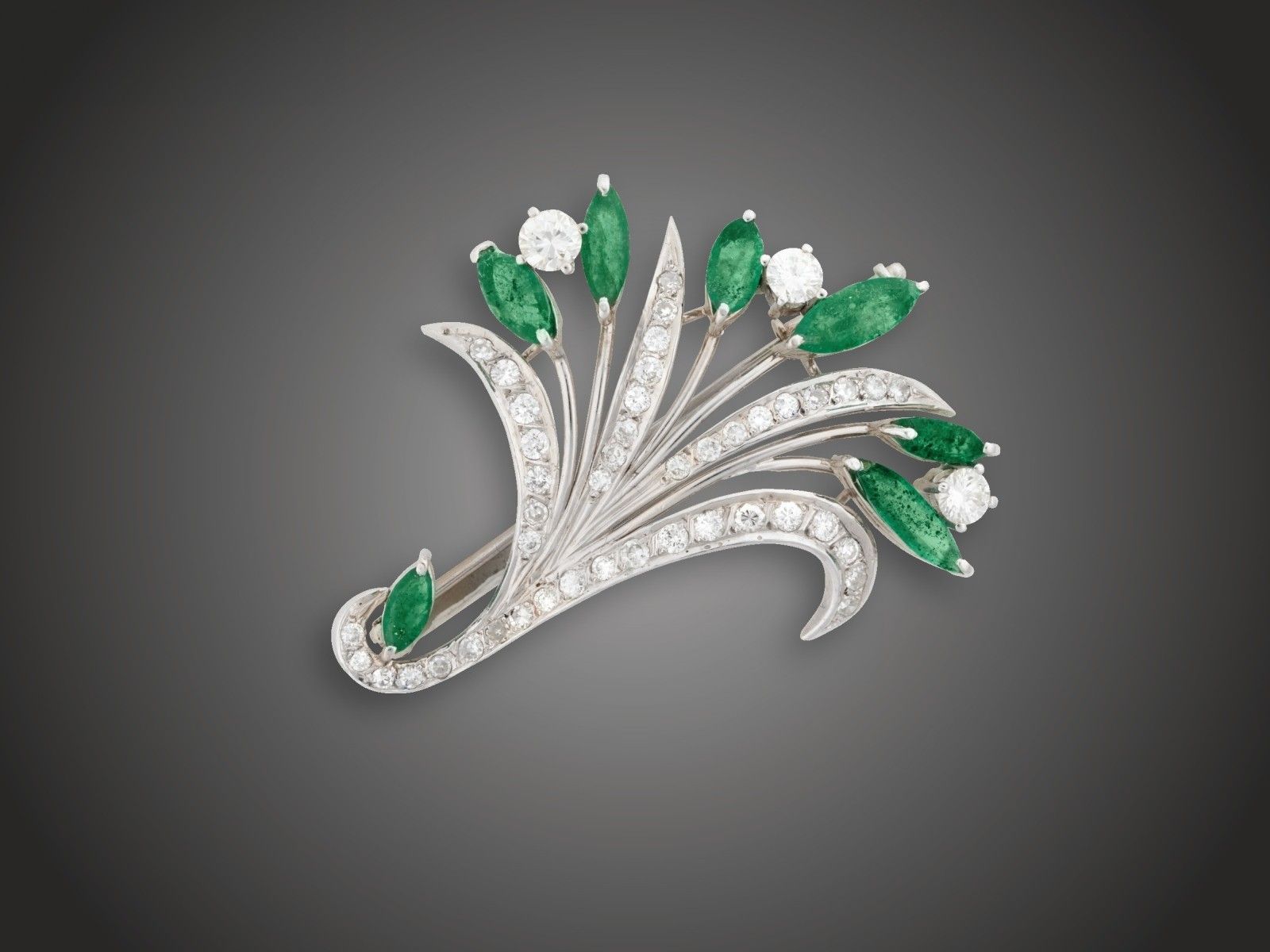 Fehérarany 585, stilizált virágcsokorforma, 7 különböző nagyságú navett csiszolású smaragd cca. 1,80 ct, 3 nagyobb briliáns cca. 0,65 ct (MTCrVs) és 44 apró briliáns cca. 1,0 ct (M-ACrSi) ékítéssel, 8,1 g