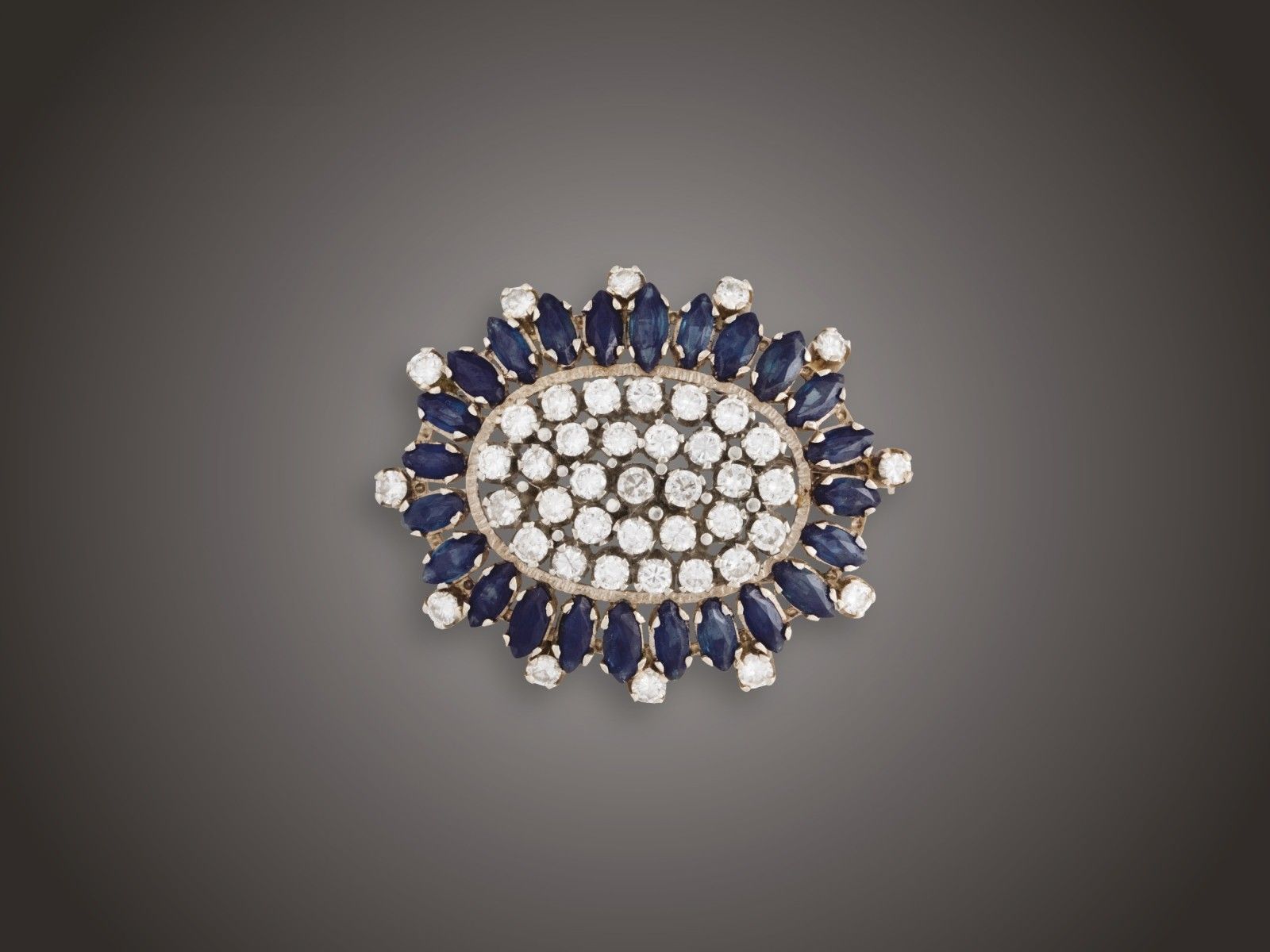Fehérarany 585, ovális formájú, stilizált virágminta, 24 navett csiszolású kék zafír cca. 7,00 ct és 44 karmos foglalású briliáns cca. 2,60 ct (MCrVSi) ékítéssel, osztrák, után fémjelzett, 11,8 g