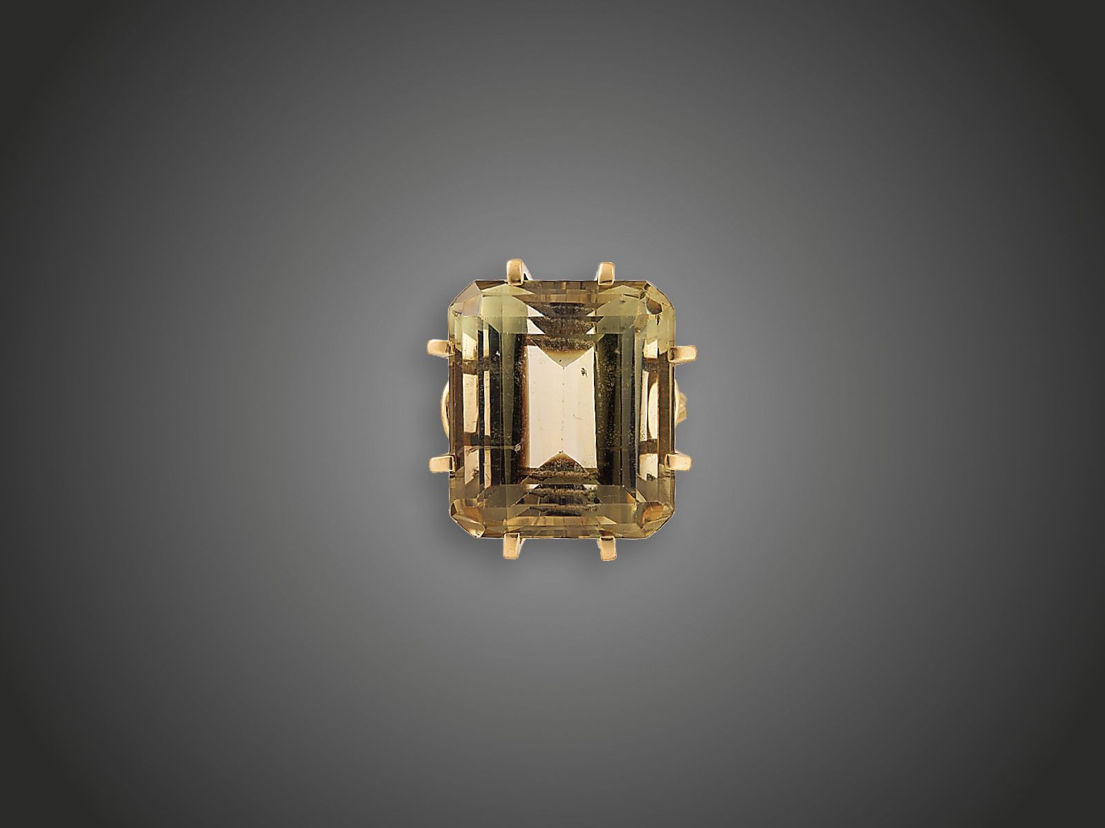 Arany 585, karmos foglalású, fazettált csiszolású, nagy füstkvarc cca. 30,00 ct, 14,0 g, méret: 56