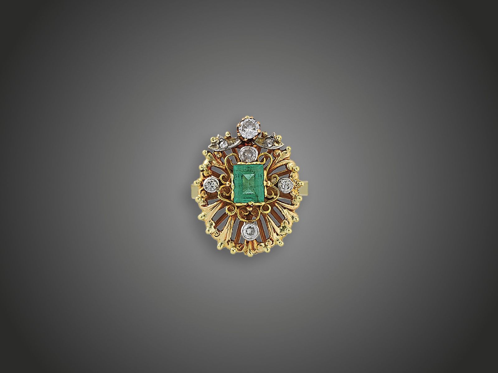 Arany 585, áttört gyűrűfejen, aszimmetrikus díszítményben szögletes formájú smaragd, 5 különböző nagyságú briliáns cca. 0,25 ct (MCrP2) és 2 apró gyémánt, 5,8 g, méret: 51