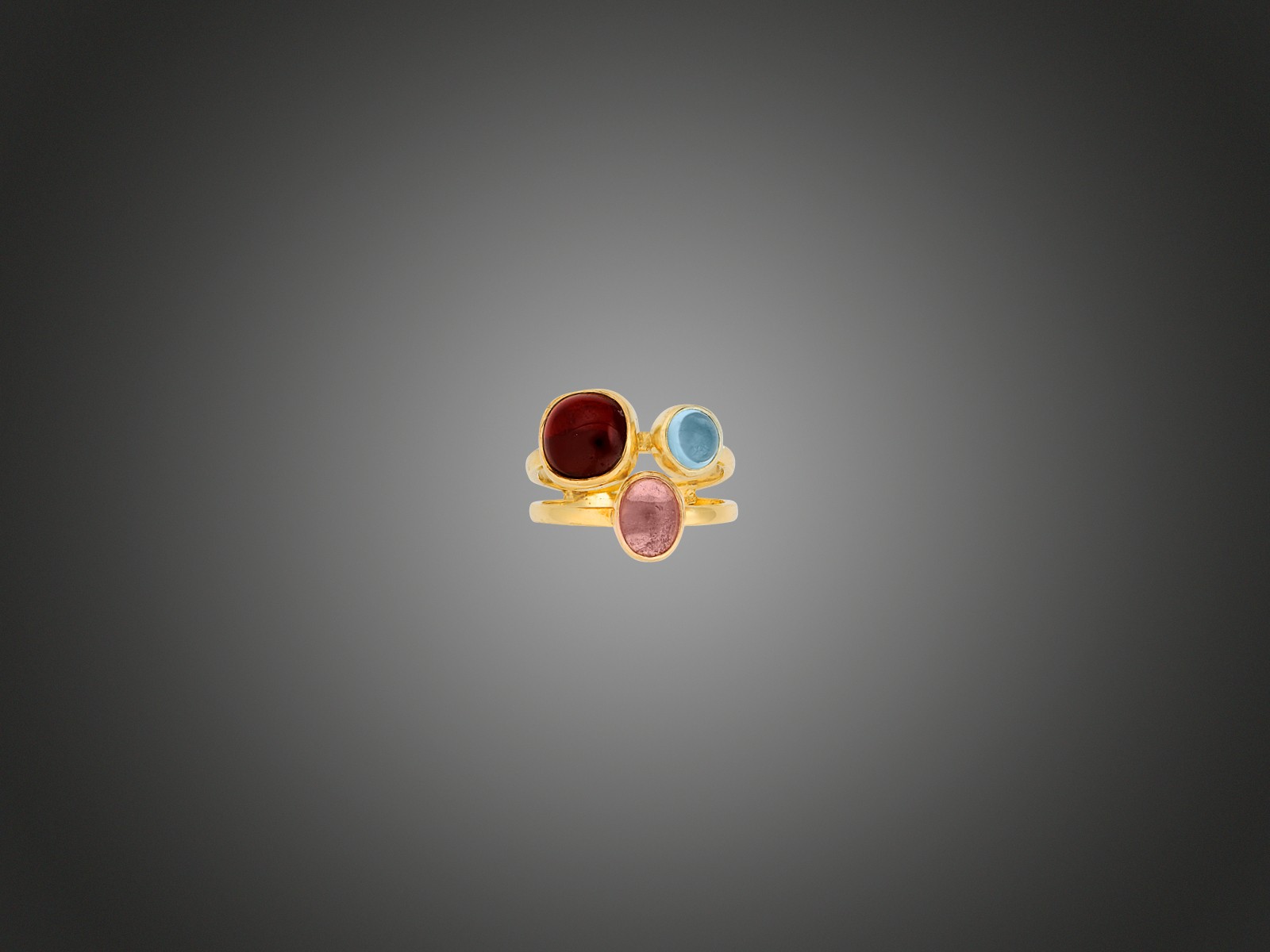 Arany 585, osztott gyűrűkarikán tokos foglaltban gránát, kék és rózsaszín turmalin díszítéssel, 6,8 g, méret: 56