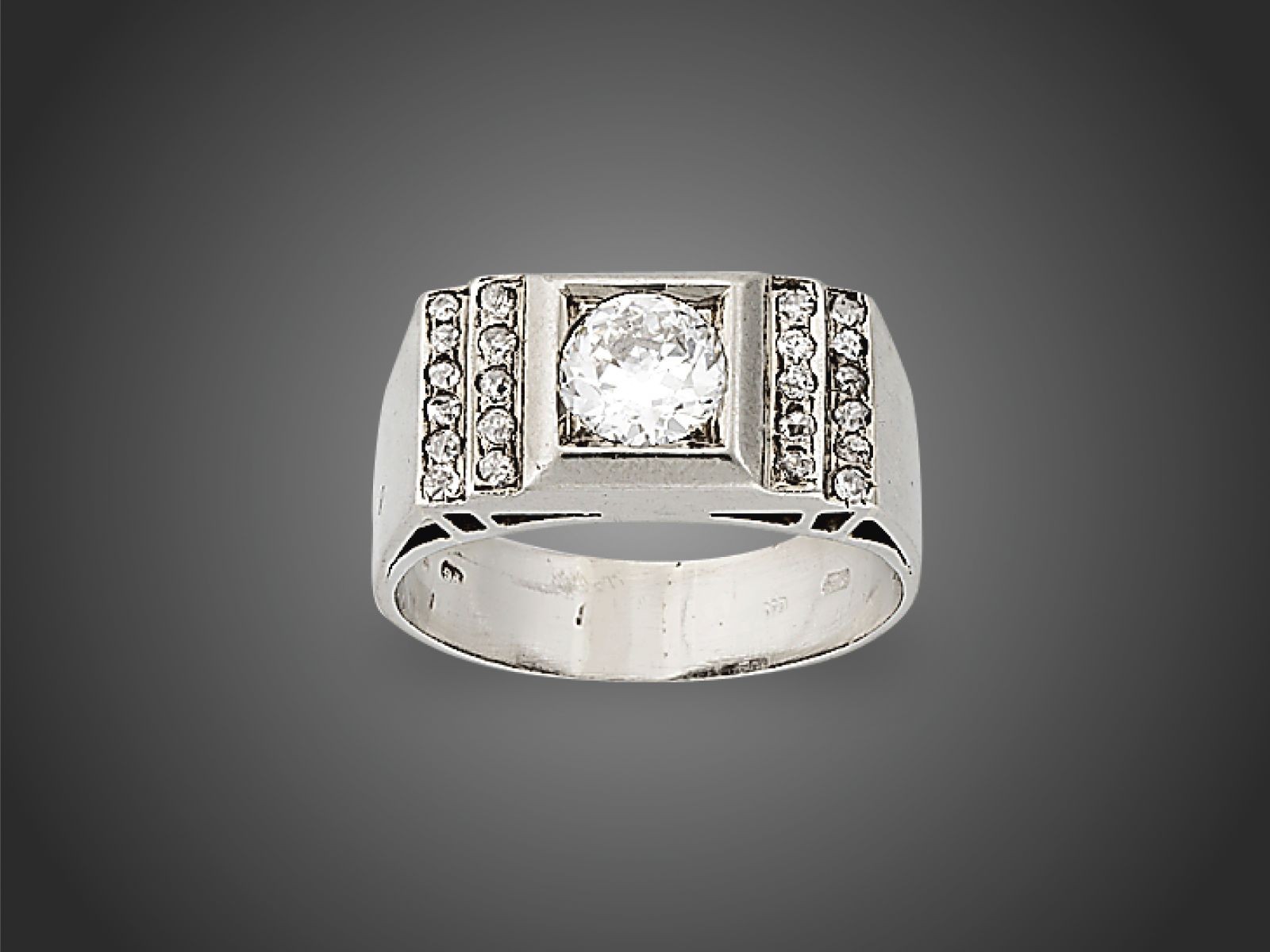 Briliáns gyűrű Fehérarany 585, középen kézi fűrészelt foglaltban 1 nagyobb, régi csiszolású briliáns cca. 0,80 ct, O, SI2, 1940 körül, 2,3 g, méret: 56