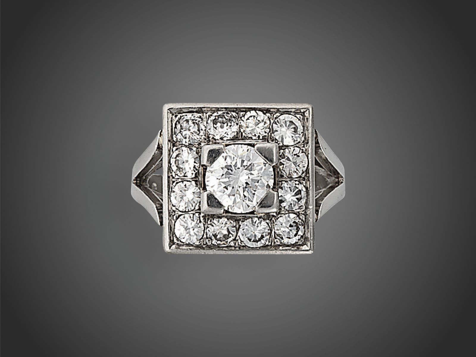 Kikiáltási ár: 680 000 FtBriliáns gyűrű Fehérarany 585, középen kézi fűrészelt foglaltban 1 nagyobb, régi csiszolású briliáns cca. 0,80 ct, O, SI2, 1940 körül, 2,3 g, méret: 56