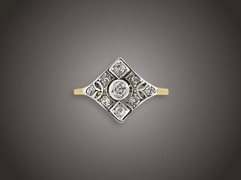 Női gyűrű Arany 580, áttört, szögletesforma fej, 9 apró régi csiszolású briliáns cca. 0,50 ct (R2CrP1) ékítéssel, 1930 körül, 2,0 g, átmérő: 16,8 mm