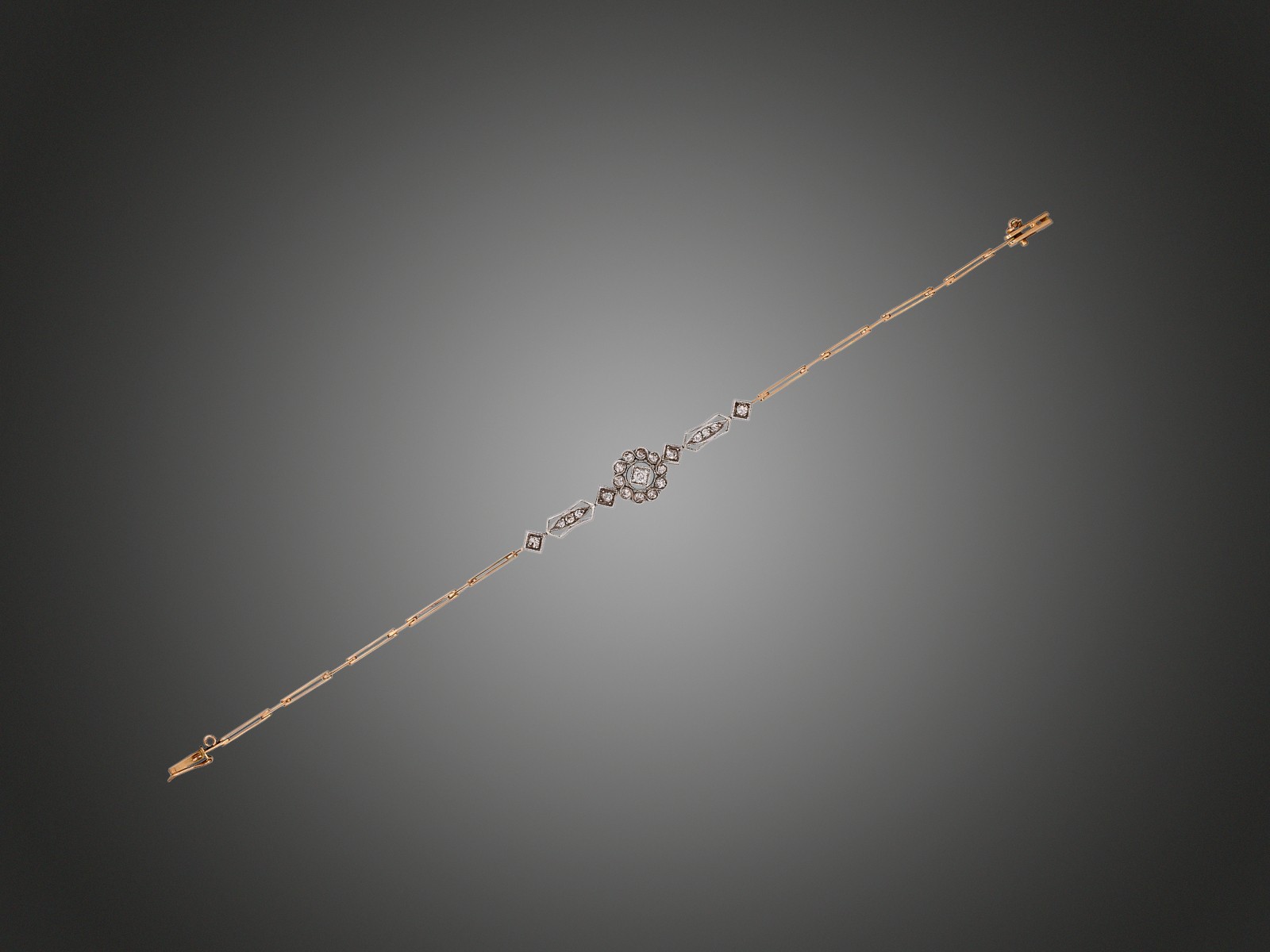 Arany 580, keskeny glides karpánt, rozetta ékszerközép, 20 régi és achtkant csiszolású briliáns cca. 0,50 ct, K, SI-P1, biztosító lánccal, 7,5 g, hossz: 19 cm