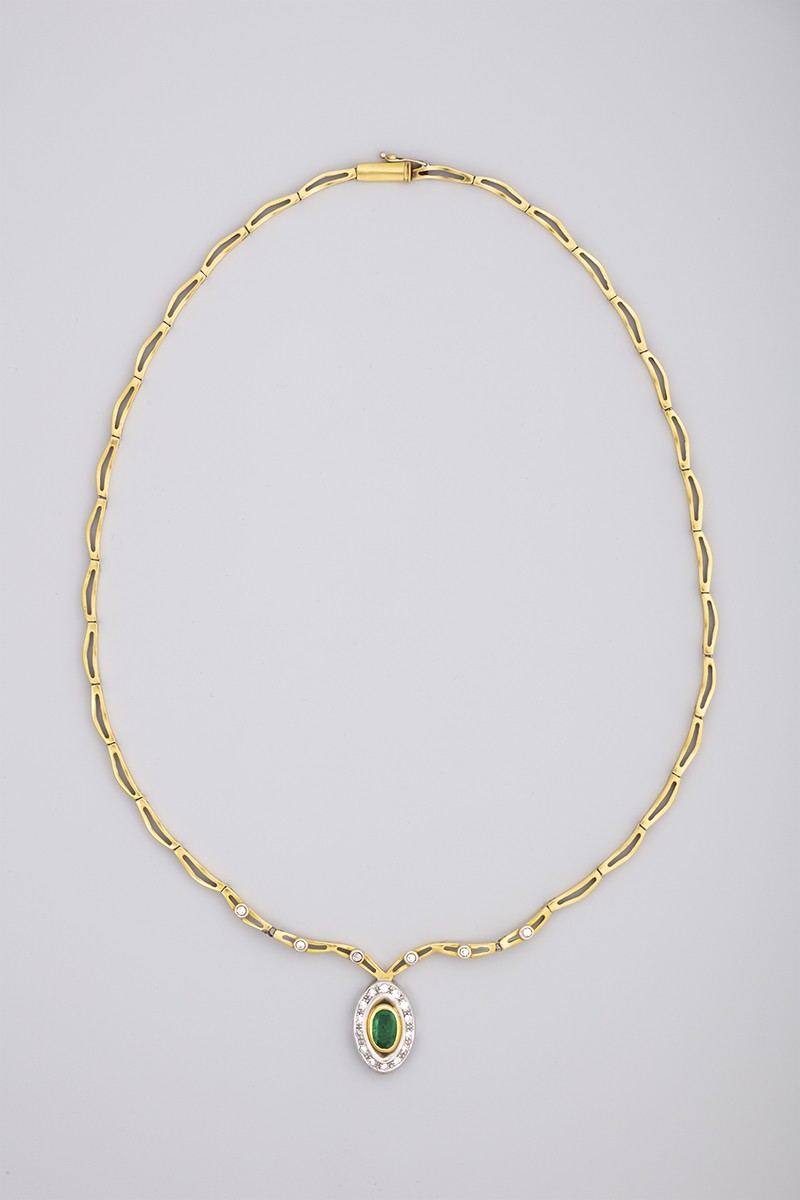 Arany 750, tagolt lánc középrészén 20 modern csiszolású briliáns cca. 0,30 ct, K, SI, 1 smaragd cca. 0,80 ct, 16,8 g, hossz: 42 cm