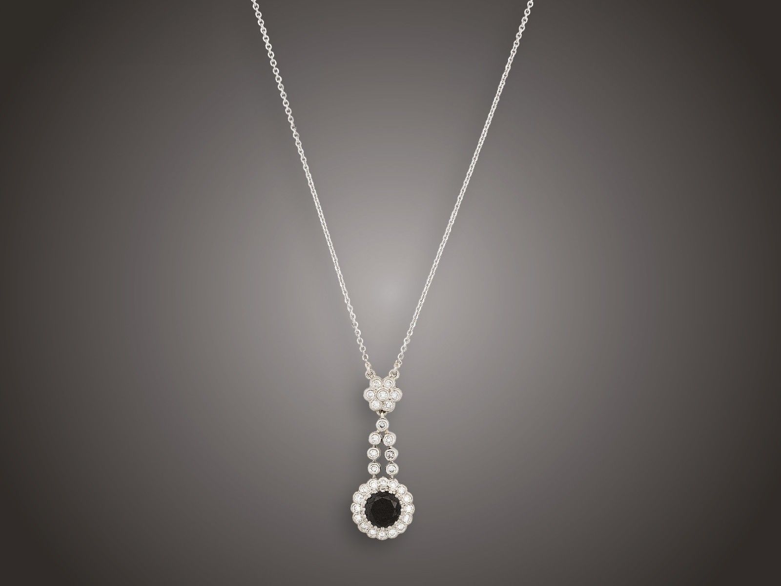 Fehérarany 585, vékony anker láncon ékszerközép, 1 karmos foglalású fekete briliáns 1,50 ct és 30 apró színtelen briliáns 0,78 ct (MTCrSi2) ékítéssel, 5,7 g, hossz: 44 cm