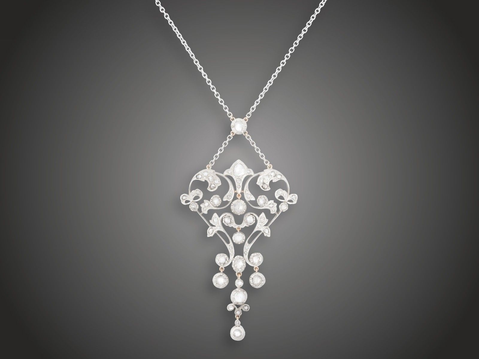 Arany 585, fehérarany anker láncon, leveles-bimbós stílusú áttört csüngős függő, 60 különböző nagyságú rózsacsiszolású gyémánt cca. 6,0 ct ékítéssel, 28,8 g, hossz: 50 cm