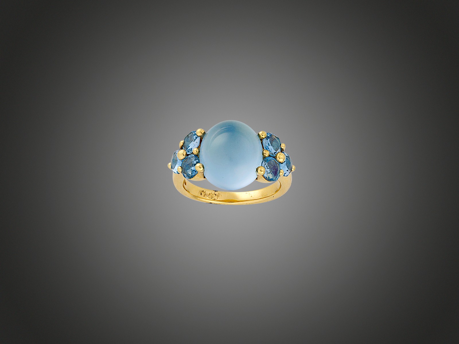 Arany 750, karmos foglaltban kaboson és fazettált csiszolású 3 kék topáz cca. 12,00 ct, modellszám: C700039963, 10,0 g, méret: 55, tanúsítvány: 000267