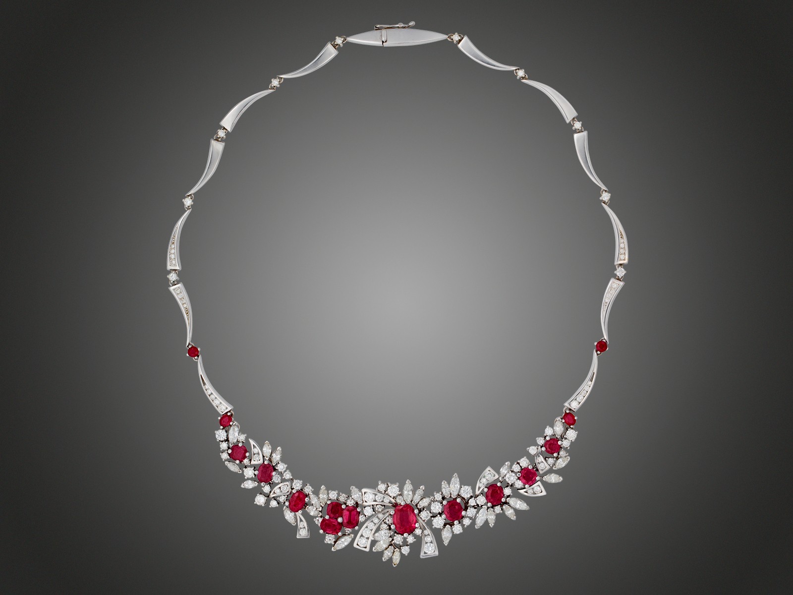 Fehérarany 750, virág forma ékszerközép és tagolt lánc elemekbe foglalt 109 briliáns és navett csiszolású gyémánt cca. 9,30 ct, H, VVS1-VS1, 15 különböző csiszolású rubin cca. 9,30 ct, 44,3 g, hossz: 42 cm, tanúsítvánnyal