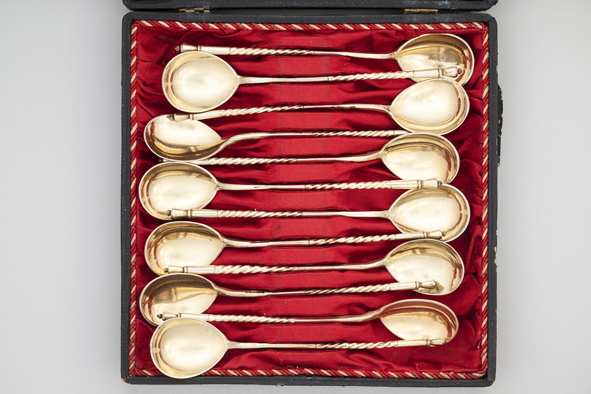 Aranyozott ezüst 84 zolotnik, csavart nyelű, vésett levélmintás díszítéssel, monogram vésettel, Moszkva, 1892, 189,4 g, méret: 14 cm