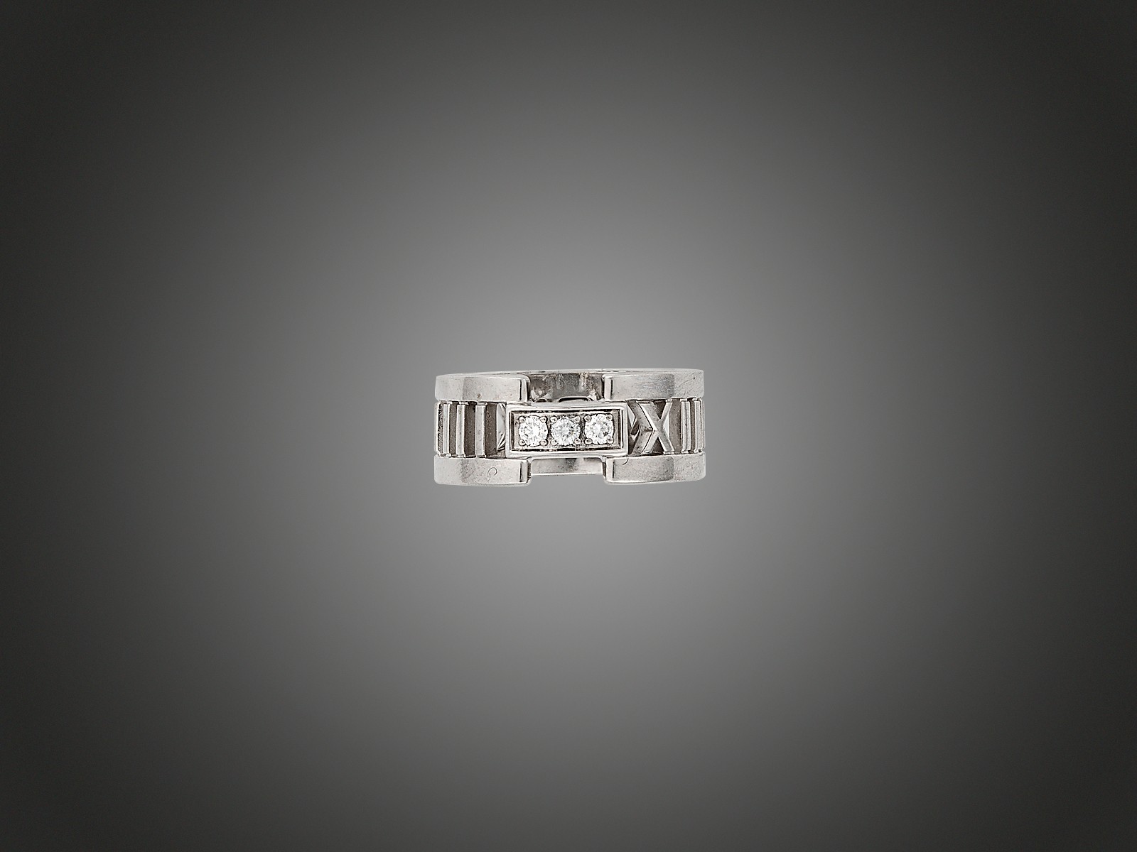 Fehérarany 750, áttört, római számos minta, középen 3 ékszer foglalású, modern csiszolású briliáns cca. 0,12 ct, G, VVS 6,5 g, méret: 54
