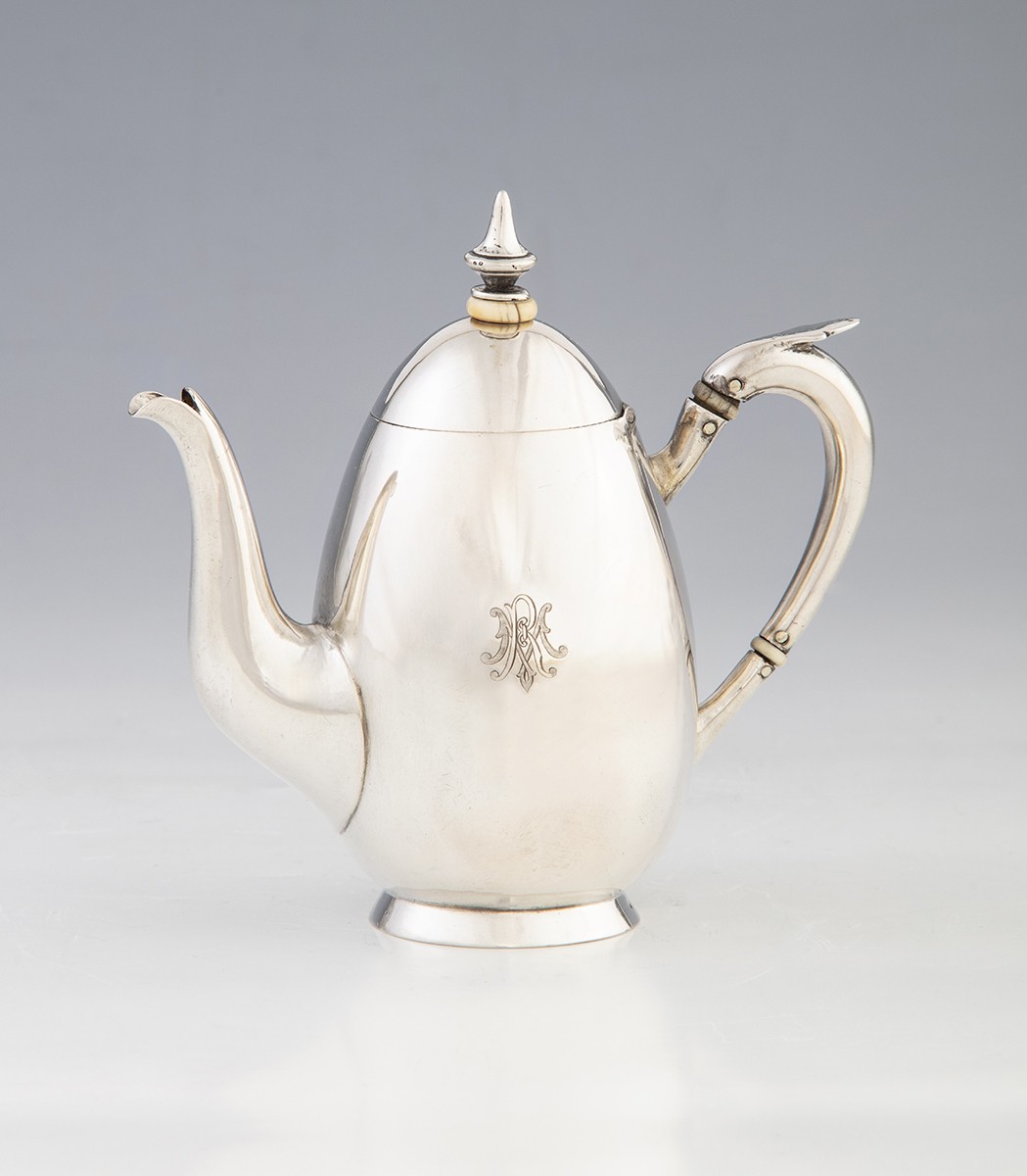Historizáló mokkáskanna Ezüst, 214 g. Tojás alakú edénytest, ívelt kiöntőcsőrrel. Zsanéros fedelén és fülén csont szigetelőgyűrűk, valamint csúcsos fedélgomb. Jelzett: Bécs, 1900 körül, Theodor Dörr. Neuwirth: I/154. M.: 13 cm