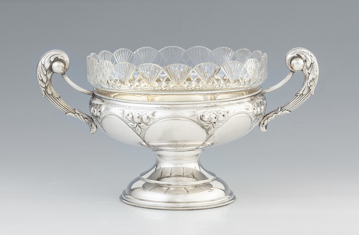 Neobarokk kínálótál Ezüst, 590 g., belül aranyozva. Gyöngysordíszes kerek talpon karéjosan osztott öblös tál, kétoldalt akantuszlevekkel díszített csigavonalas fülekkel. Peremén domborított és vésett, bécsirózsás virágdíszek. Eredeti, fúvott és csiszolt,