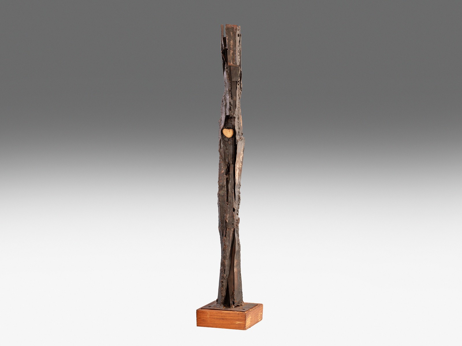 Kikiáltási ár: 70 000 FtPercz János (Budapest, 1920 – Budapest, 2000) Figurális gyertyatartó Hegesztett vaslemez. Jelzés nélkül. M.: 59 cm