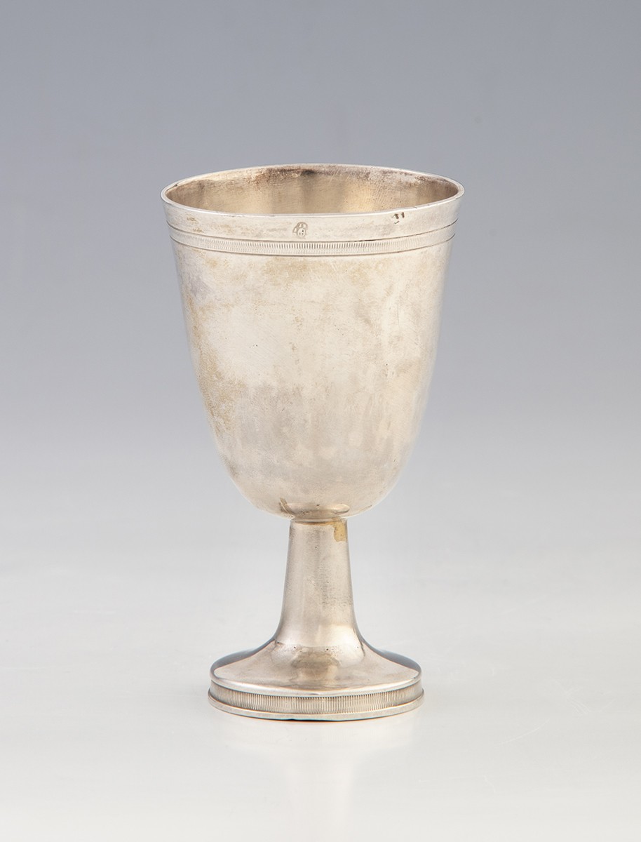 Talpas pohár Ezüst, 94 g. Kerek talpon kúpos szár harang alakú kehellyel. Peremein hengerelt díszít-ménnyel. Szájperemén jelzett: Bécs, 1800 körül. M.: 10,7 cm