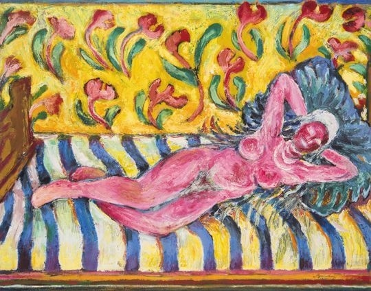 121. tétel, Vörös akt csíkos pamlagon, 1952