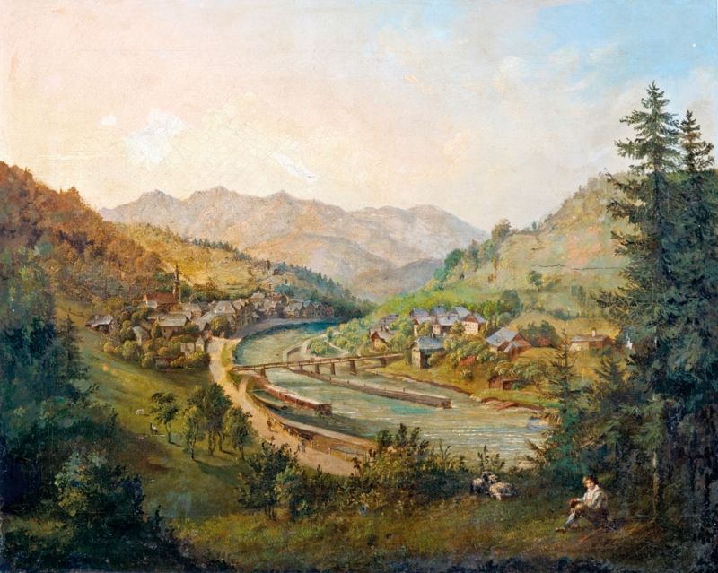 136. tétel, Osztrák festő, 19. sz. közepe: Alpesi táj folyóval
