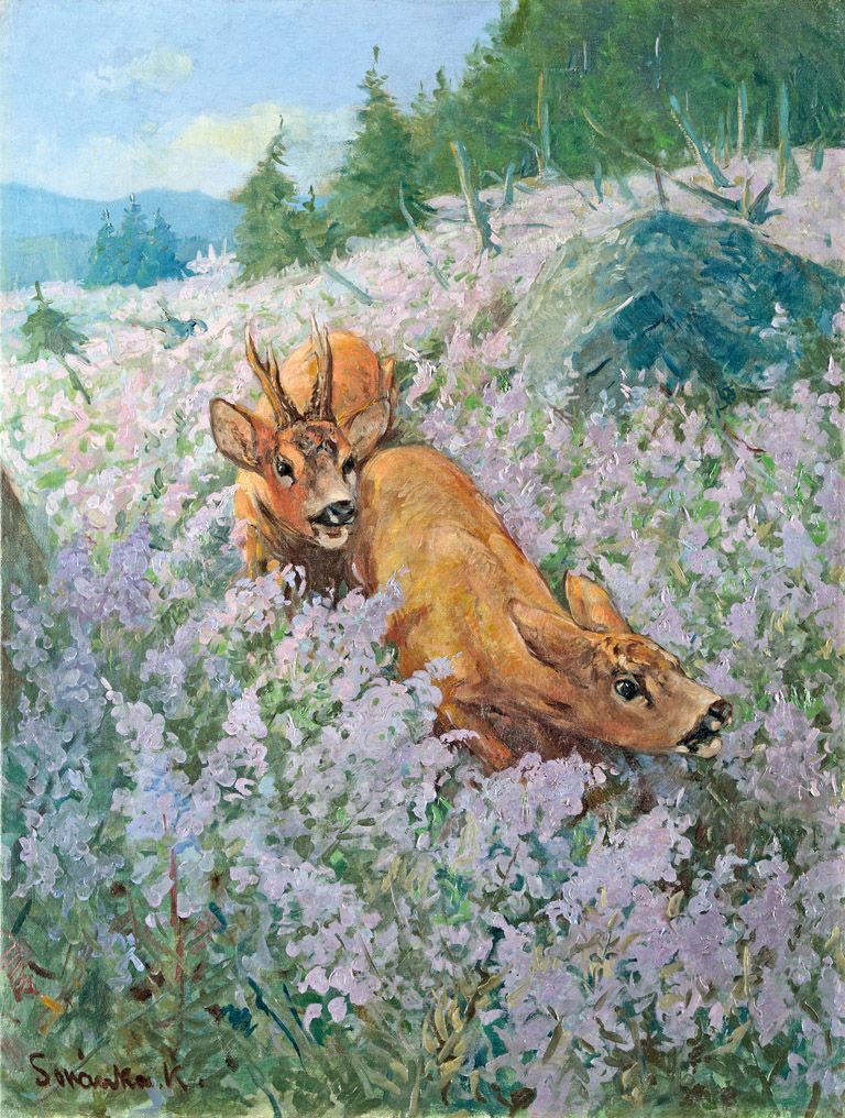 151. tétel, Sovánka Károly (1883-1961): Őzek a virágos mezőn