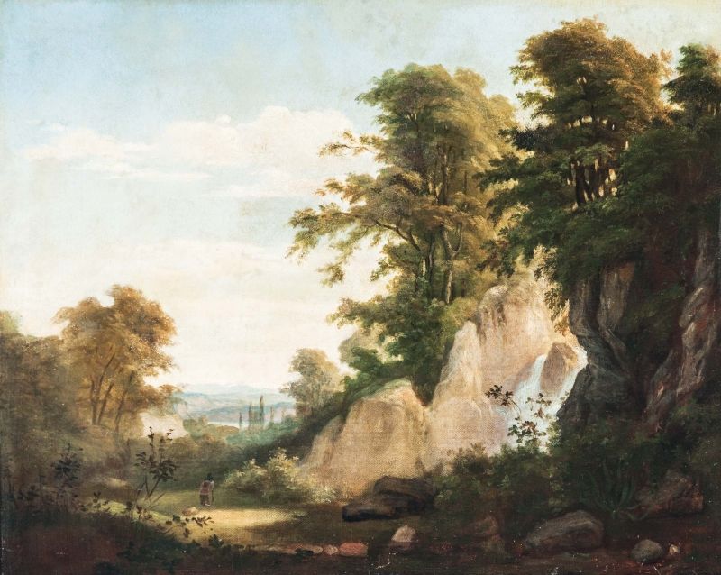 168. tétel, Francia festő, 18. sz. vége: Italianizáló tájkép vándorral