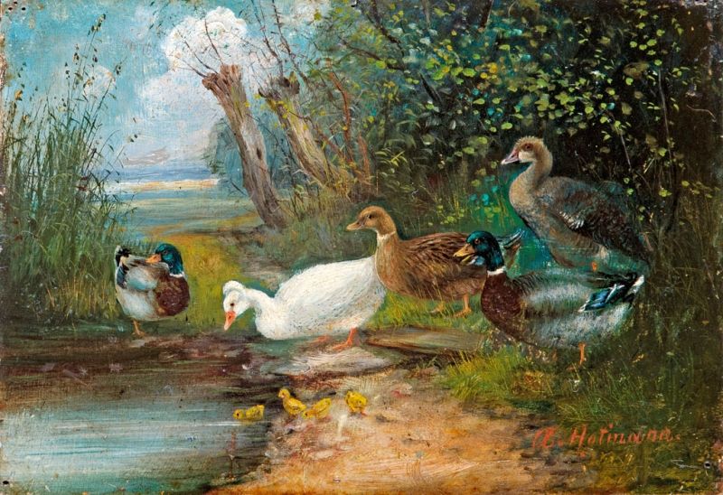 189. tétel, Hofmann, A. jelzéssel, 19. sz. második fele: Kacsák a vízparton