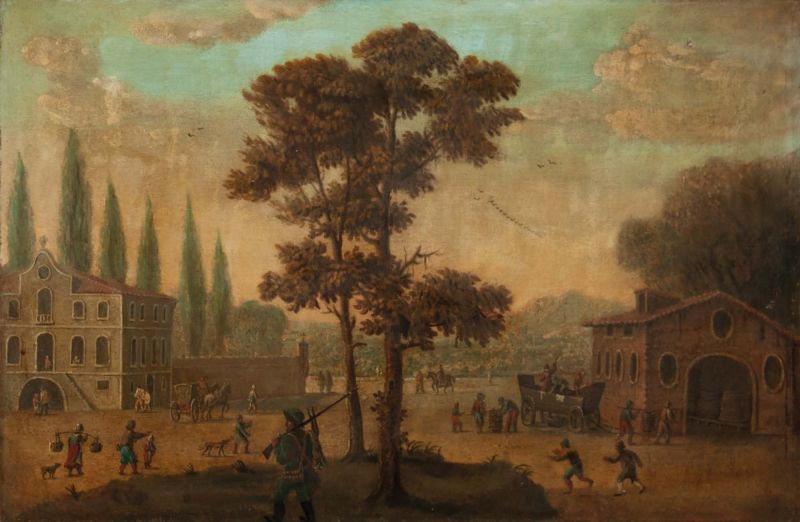 210. tétel, Német festő, 18. sz.: Városrészlet alakokkal