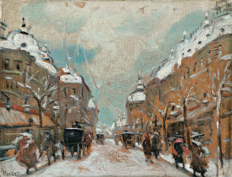 344. tétel, Berkes Antal (1874-1938): Téli utcarészlet