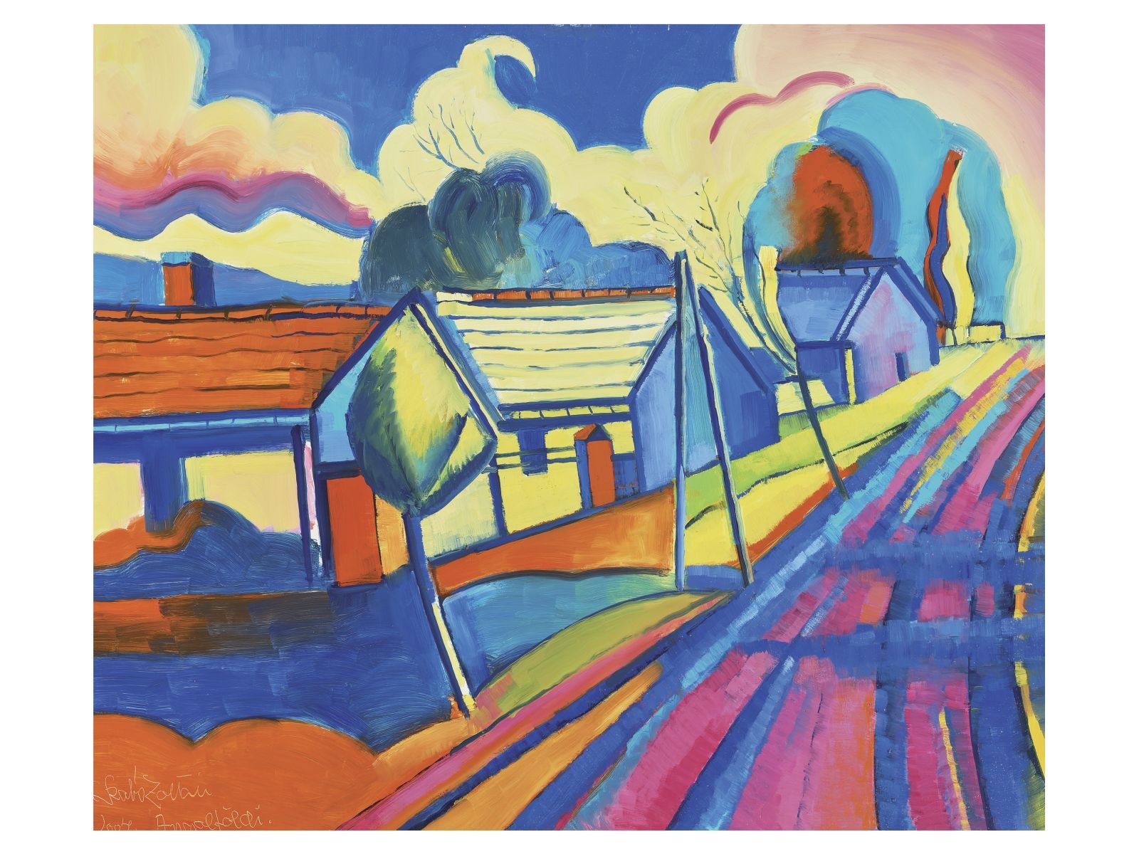 Kikiáltási ár: 650 000 FtKlie Zoltán (Szekszárd, 1897 – Budapest, 1992) Házak Olaj, farost 60 × 80 cm Jelezve jobbra lent: Klie Z.
