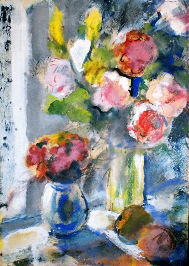 Műtárgy leírás – Bényi László Rákosliget, 1909 – Budapest, 2004 VIRÁGOK ABLAKBAN Tempera, pasztel, akvarell, papír 480 × 340 mm Jelezve jobbra lent: Bényi