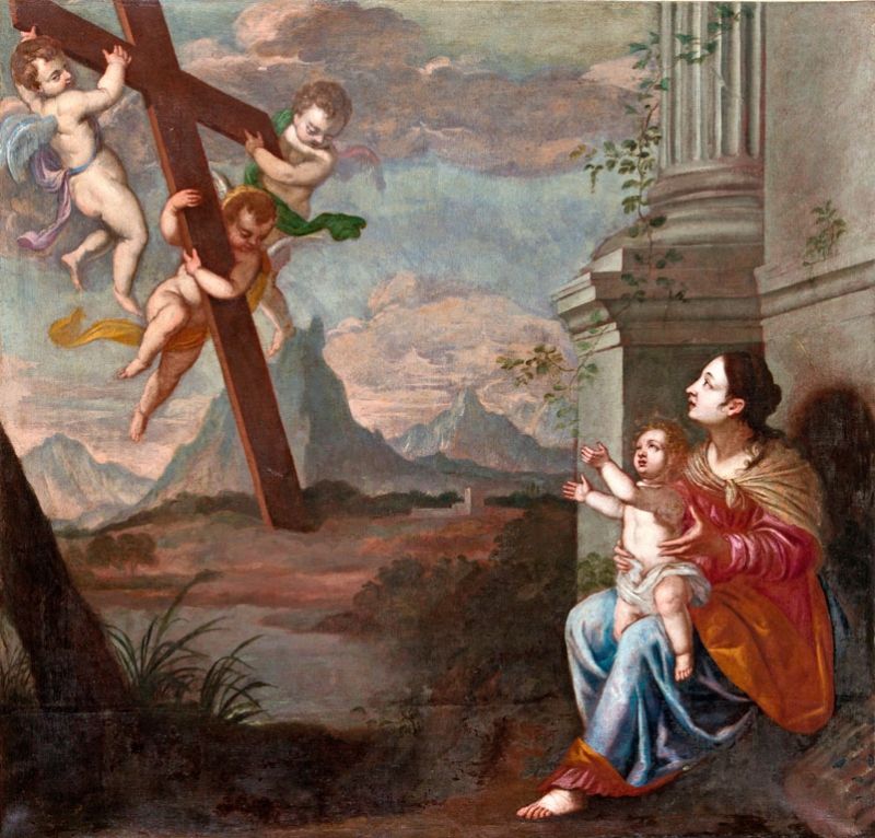 81. tétel, Itáliában működött flamand festő, 17. sz. első fele: Mária a gyermek Jézussal és a keresztet hozó angyalokkal
