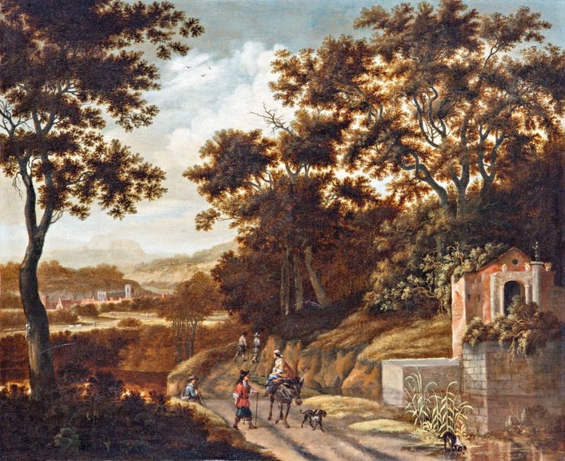 97. tétel, Flamand festő, 17. sz. közepe: Tájkép vándorokkal