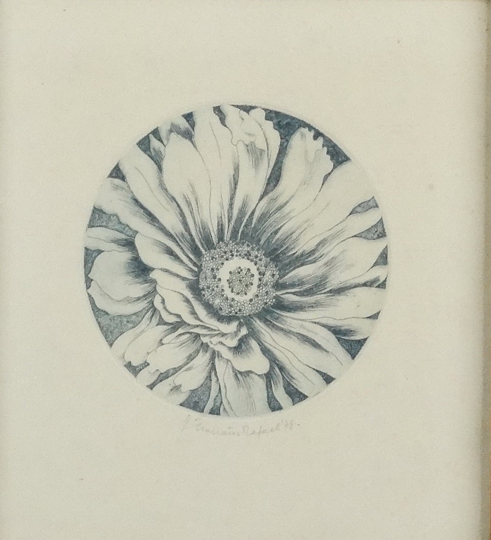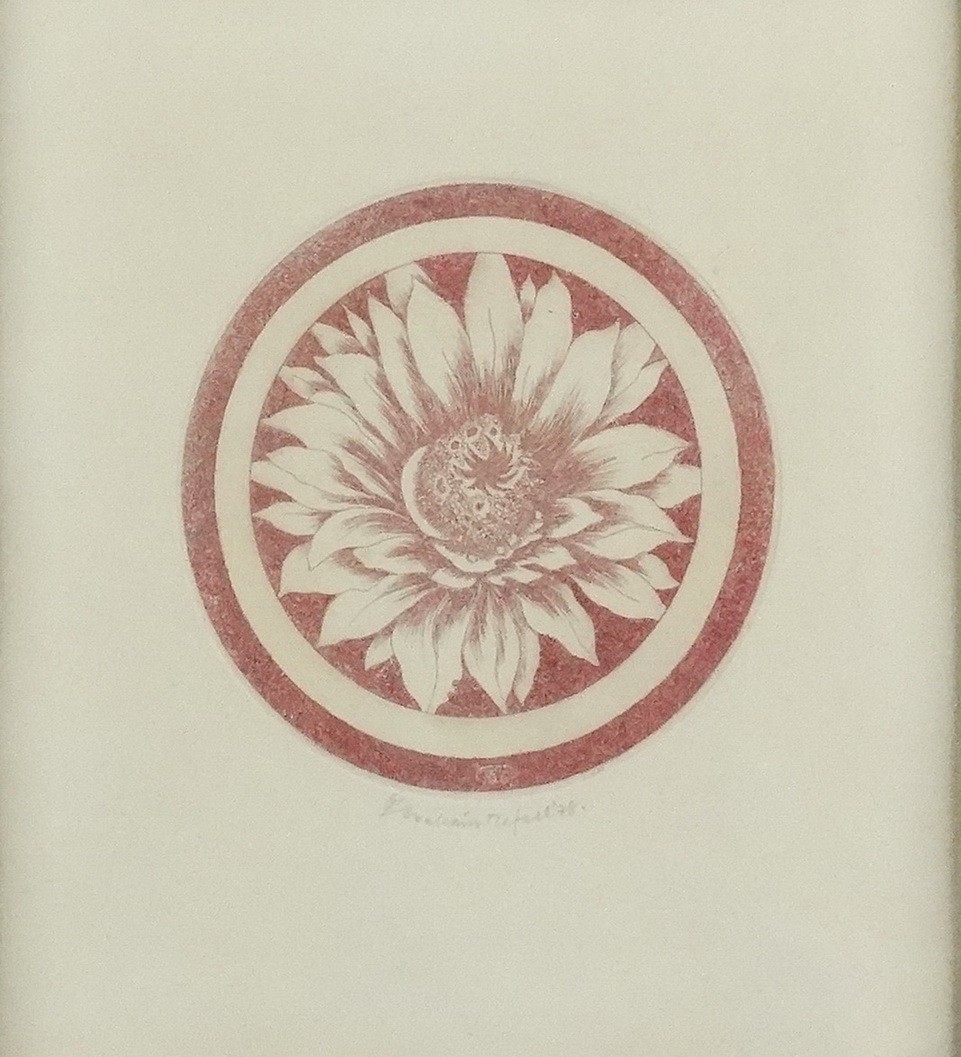 színes rézkarc, jkl., keretben, 12 x 12 cm