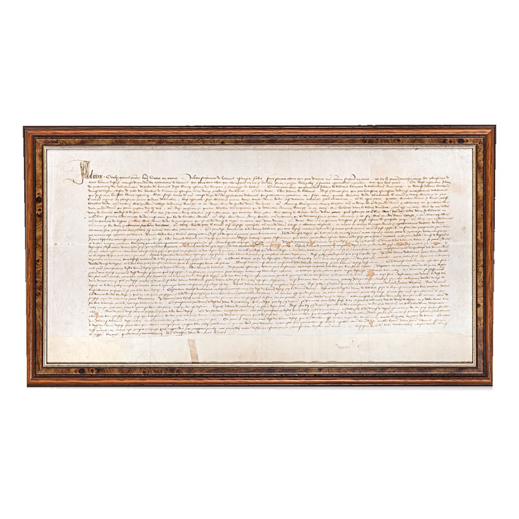 francia, 1435, tus, papír, ófrancia nyelven írt okirat, melyben Jehan de Hamnie nyilatkozik nemes urak előtt, hogy tartozása fejében lemond birtokairól, sérült, 25,5*49,5 cm